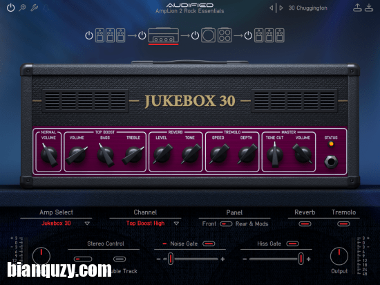AmpLion 2 Rock Essentials 有三种主要的放大器模型可供选择: Bartender Deluxe 65,它是 Fender 仿真; Martial 59,Marshall 的复制品,以及 Jukebox 30,就像 Vox AC30 Top Boost。每个放大器型号都有多个通道和一个非常漂亮的面板开关,用于查看 mods 和选项,例如“Brown Sound”。Bartender 和 Jukebox 都内置了混响和颤音,底部是通用输入、输出、立体声控制、双轨、噪声门和嘶嘶声门。