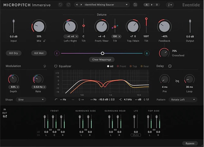 我们从头开始设计了 MicroPitch Immersive,以实现沉浸式、杜比全景声 (Dolby Atmos) 和环绕声工作流程。MicroPitch Immersive 具有多达 12 个调谐空间延迟通道,以及调制、均衡器和交叉馈送控制,可让您创建具有反射、移动、消散和溶解边界的沉浸式空间。无论是增加空间,还是通过延迟和俯仰俯冲来制造混乱,MicroPitch Immersive 都可以帮助您创建真实和虚幻的沉浸式现实。