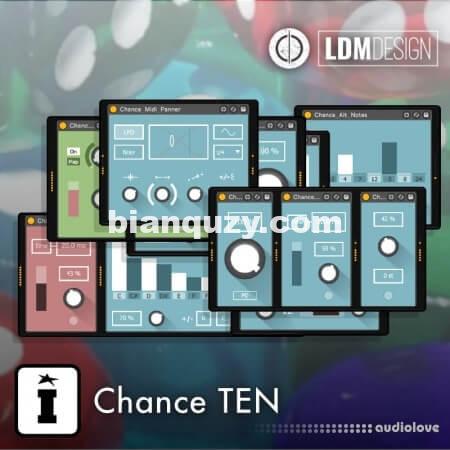 The Chance TEN pack is a set of simple MaxforLive devices based on probability and randomness, inspired by the scripts used by Brian Eno. These MIDI devices allow you to set the probability of notes passing through or being altered, in their pitch and velocity values. Other devices use MIDI input to trigger parameters in Live. Creating these as single function devices allows you to mix and match as you like and create unique MIDI FX chains.